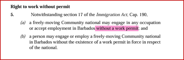 On Tuesday October 14, the Lower House passed the Caribbean Community (Free Movement of Nationals) Bill, 2025. Unless the Act is rejected by the Upper House, Barbadians will face much stiffer competition for local jobs because at section 5 shown below, the Act gives “freely moving” CARICOM citizens the right to work here WITHOUT A WORK PERMIT.