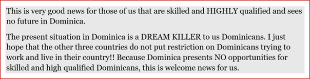 In the case of Dominica, to date we have not seen any such legislation. What is interesting though, is that some Dominicans have expressed delight in the free movement protocol. One commenter on dominicanewsonline.com had this to say: